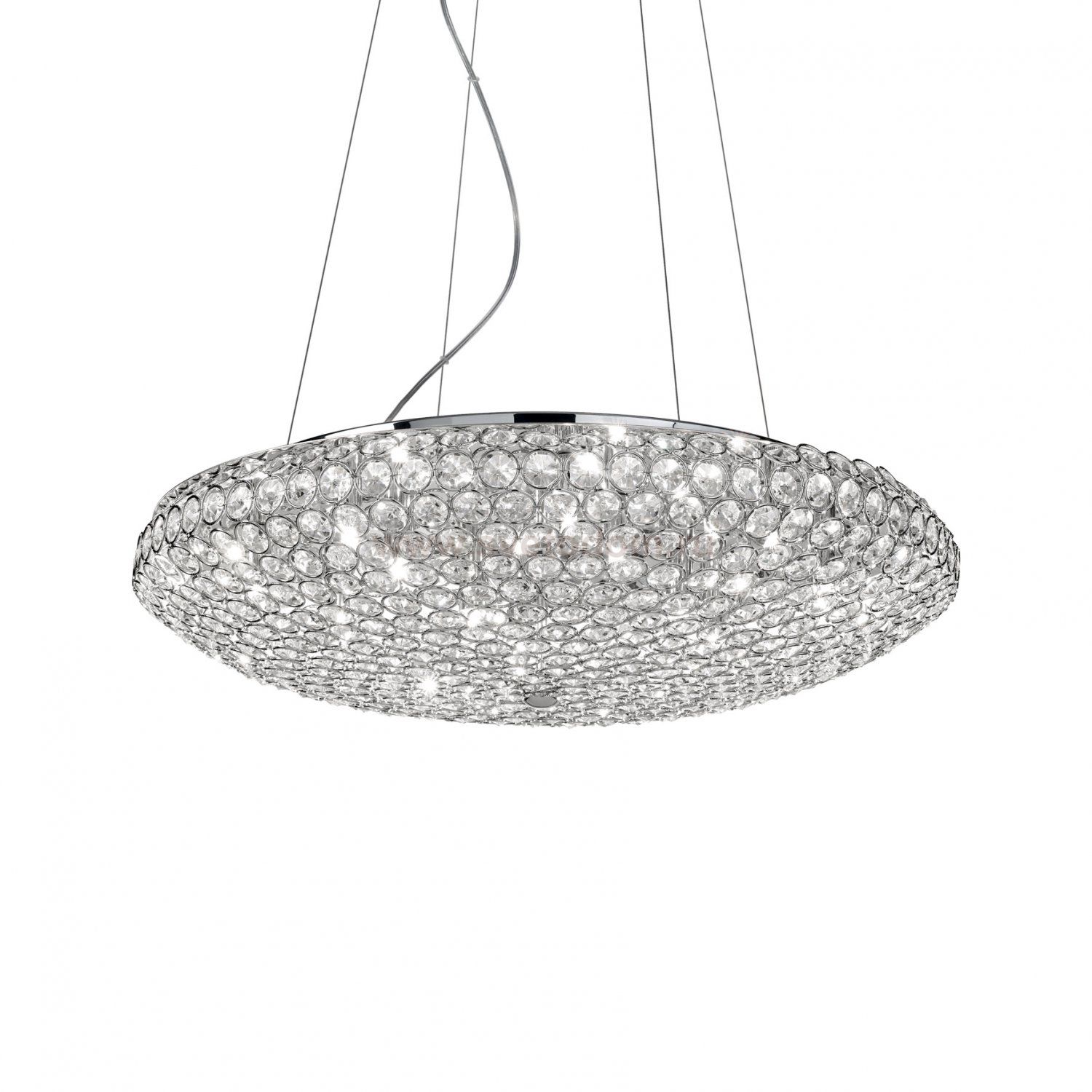 Люстра от известной итальянской фабрики Ideal lux из каталога Moderno в современном стиле под артикулом KING SP12 CROMO (88013) серии KING имеет ряд отличительных характеристик: Рассеиватель состоит из металлических колец серебряного или золотистого цвета с восьмиугольными хрусталиками внутри. Подвесы со стальными тросиками регулируемыми по длине с помощью автоматического устройства.