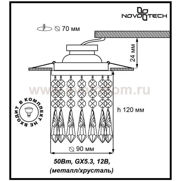 Декоративный встраиваемый светильник модели Novotech 369797 из серии RITZ отличается следующим качеством: Основание светильника сделано из металла. Это популярный и востребованный материал благодаря ряду качеств. К ним относится: повышенная прочность, износостойкость и долговечность. Подвески изготовлены из хрусталя. Он обладает высоким показателем плотности, прозрачности и блеска. Благодаря содержанию свинца (не менее 30%) и определённому подбору углов, образуемых гранями, изделия из хрусталя отличаются необыкновенно яркой, многоцветной игрой света, чарующей магией красоты, совершенства и роскоши. А так же, он обладают красивым звоном.