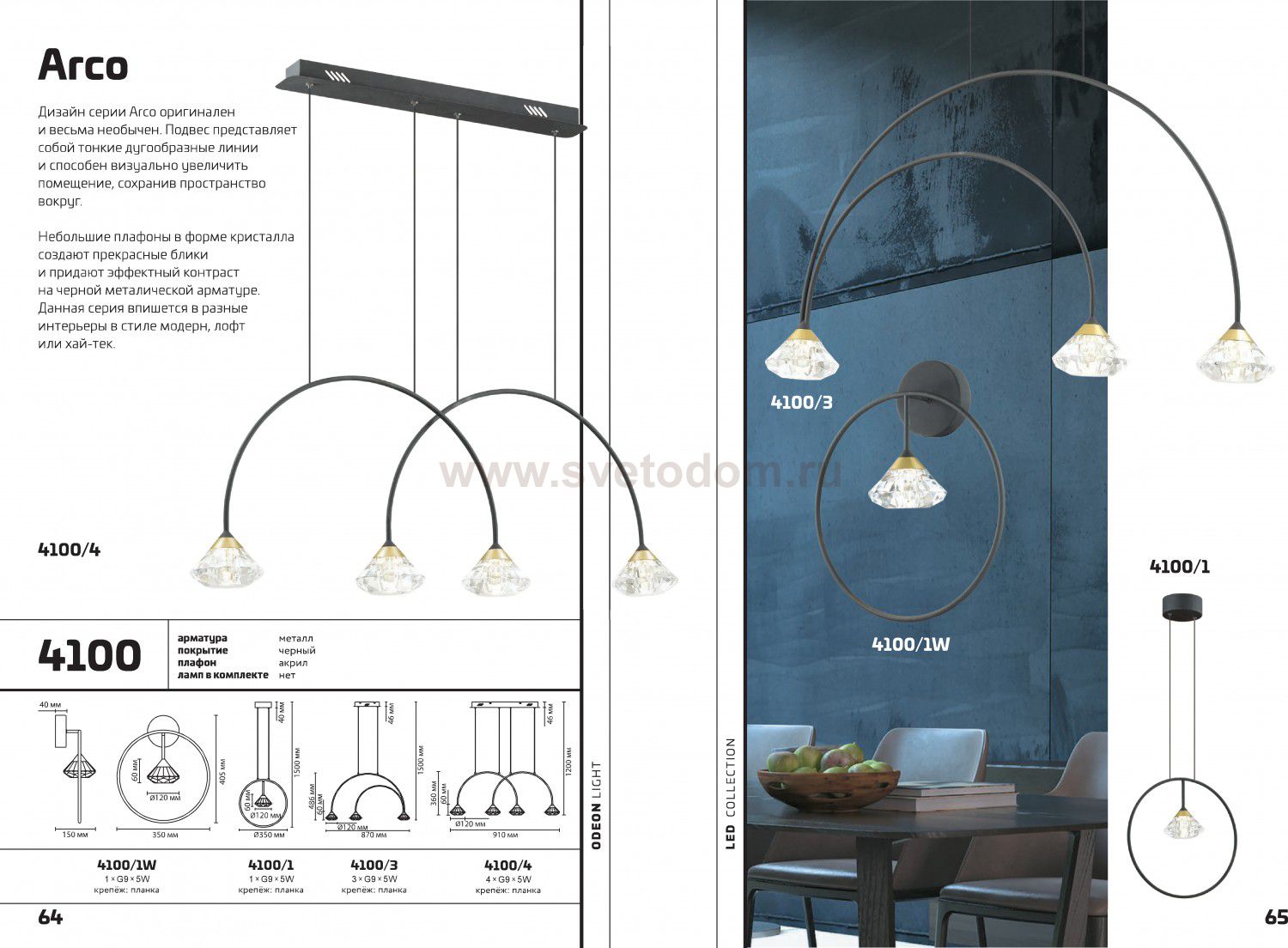 Дизайн линии Arco оригинален и весьма необычен. Подвес представляет собой тонкие дугообразные линии и способен визуально увеличить помещение, сохранив пространство вокруг. Небольшие плафоны в форме кристалла создают прекрасные блики и придают эффектный контраст на черной металлической арматуре. Данная линия впишется в разные интерьеры в стиле модерн, лофт или хай - тек.