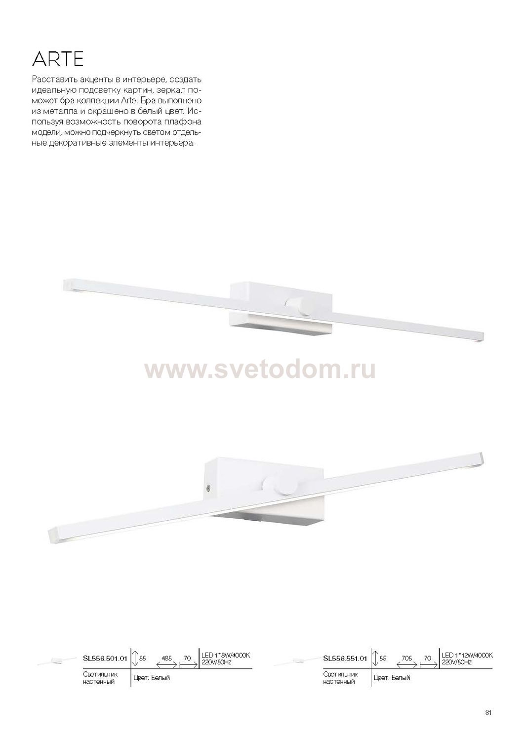 Если Вы настроены купить светильник модели SL55655101, то обратите внимание: Расставить акценты в интерьере, создать идеальную подсветку картин , зеркал поможет бра коллекции Arte. Бра выполнено из металла и окрашено в белый цвет. Используя возможность поворота плафона модели, можно подчеркнуть светом отдельные декоративные элементы интерьера.