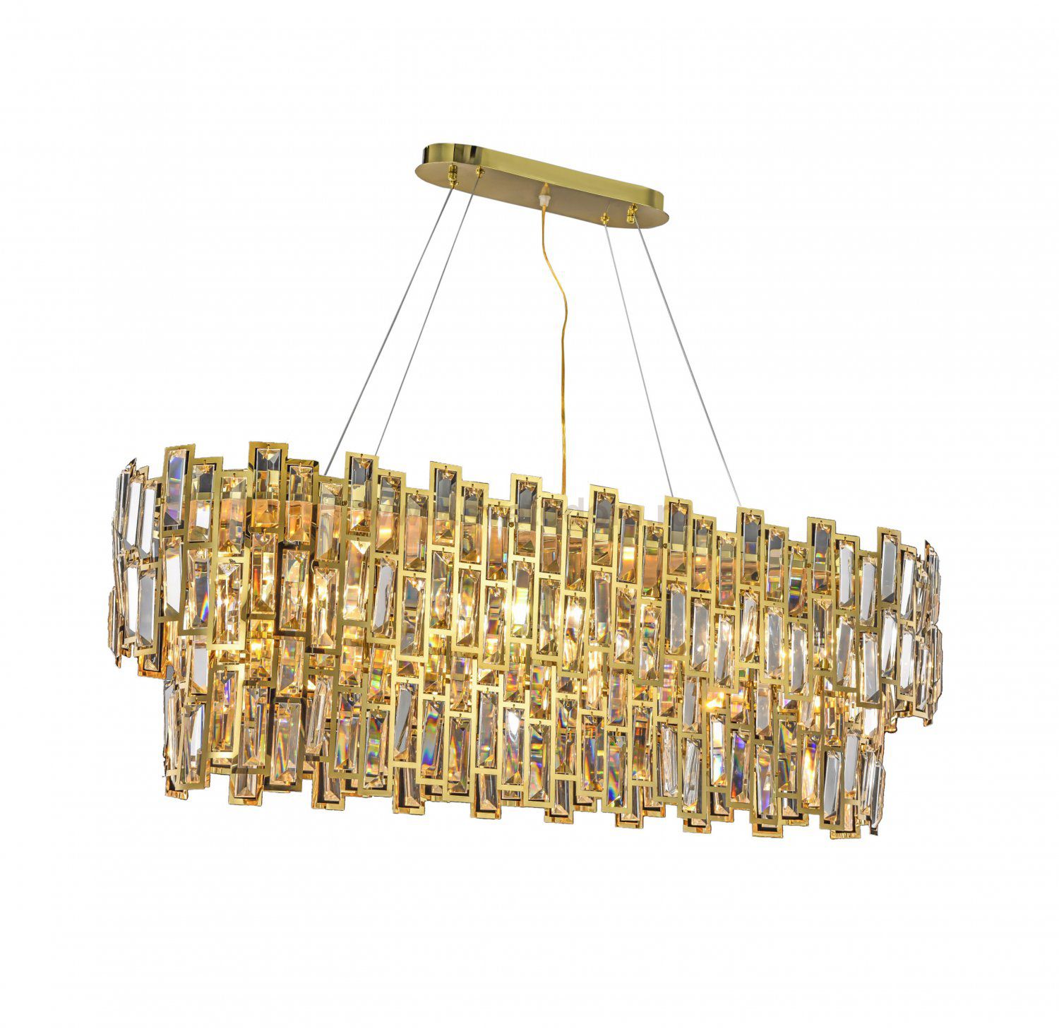 Люстра Princess 1000 продолговатой формы со множеством изящных стеклянных пластин с зеркальной поверхностью. Пластины выполнены в прямоугольной форме и заключены в золотое обрамление, способны эффектно рассеивать свет со множеством разноцветных бликов, создающих праздничное настроение.