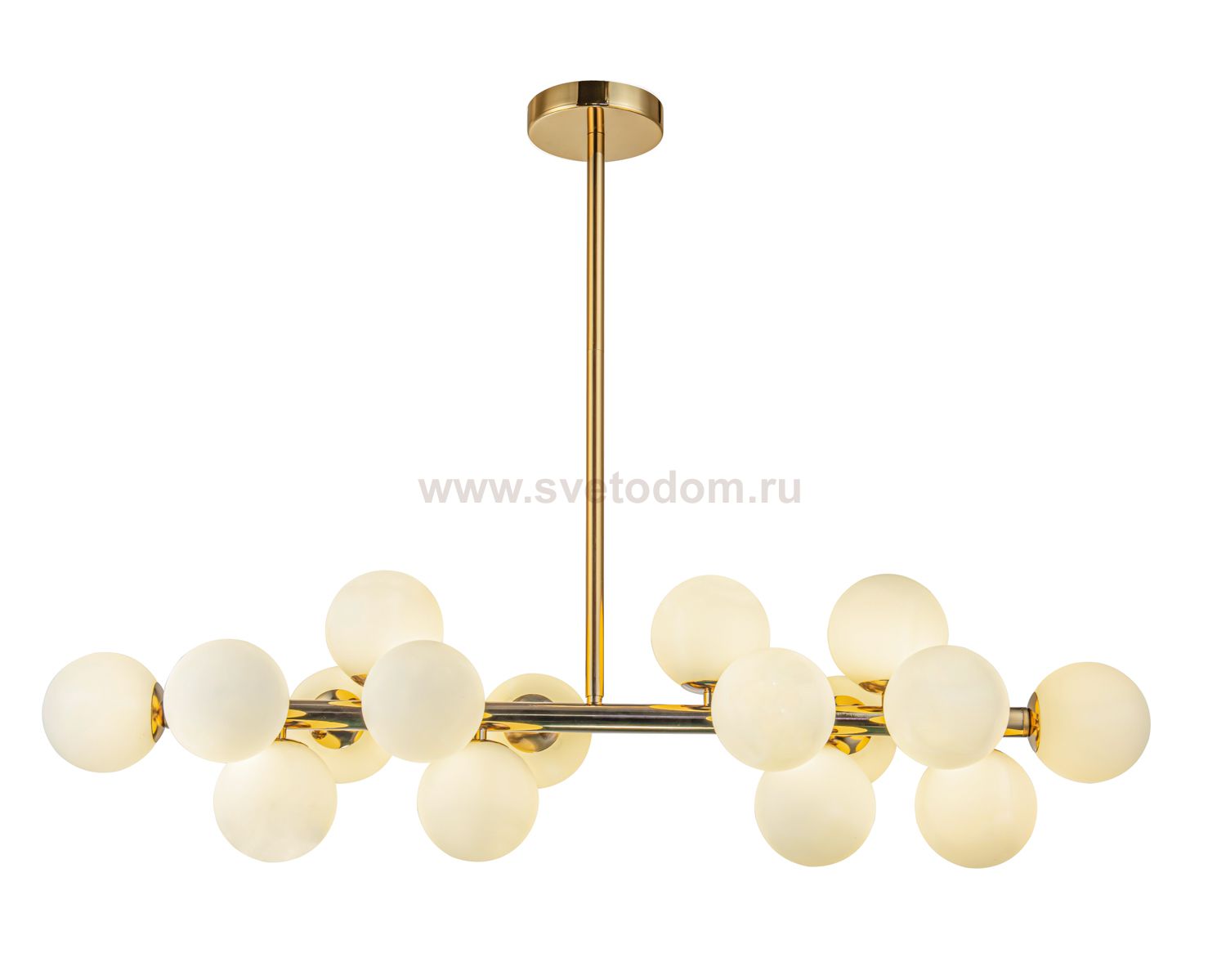 Люстра Marsiada L950 выполнена в сдержанном дизайне на основе металлического каркаса цвета золота. Центральную часть изделия занимает длинный стержень, к которому крепятся 16 держателей с цоколями G4 на концах. Светодиодные лампочки закрывают сферические плафоны из матового стекла, способного рассеивать и слегка приглушать проходящий через него свет.