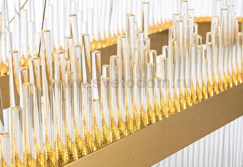 Подвесная люстра Stripglass на металлической арматуре цвета латунь. Плафон состоит из множества стеклянных цилиндрический полосок, которые прекрастно рассеивают свет от вмонтированной внутрь корпуса светодиодной ленты.