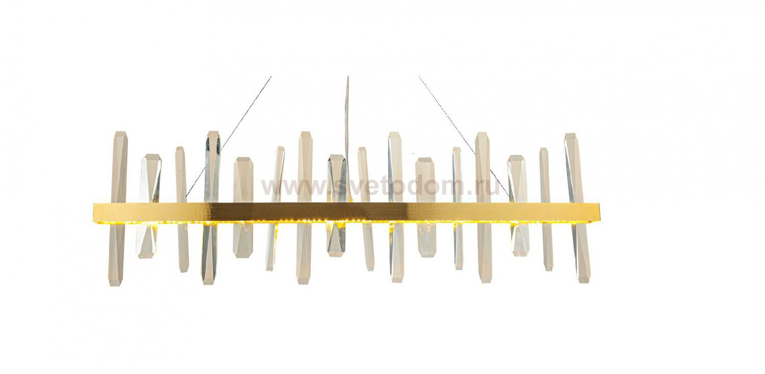 Люстра Gertrudis вытянутой формы, со множеством прозрачных стеклянных элементов, прикрепленных к пластине из металла под цвет золота. Светильник подвешивается к потолочной планке посредством трех тонких металлических нитей повышенной прочности. Подходит для оформленных в современном стиле квартир, гостиниц, офисов, ресторанов, ночных клубов и кафе.