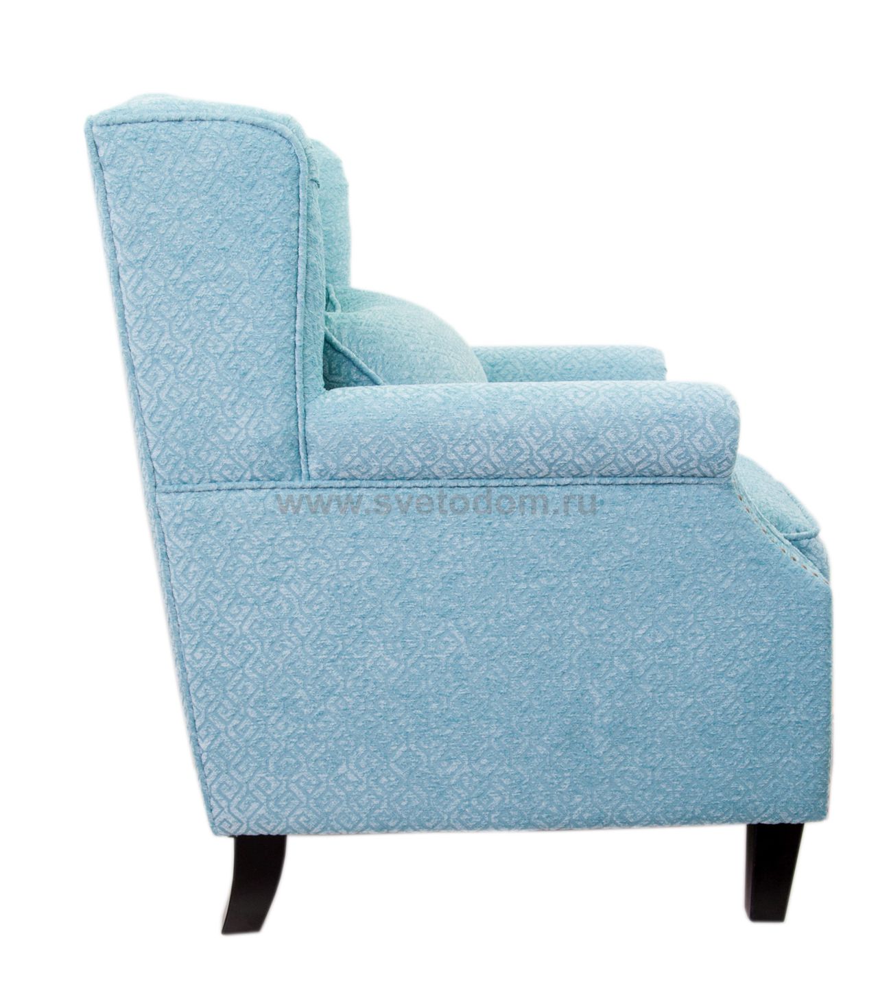 Кресло Scott Blue выполнено в элегантном дизайне, на основе прочного деревянного каркаса, упругого наполнителя и мягкой обивки из натуральной ткани. По синему фону материи проходят белые контуры ромбов, лицевая часть закругленных подлокотников декорирована заклепками. Модель поставляется в комплекте с маленькой подушкой с верхом из той же ткани.