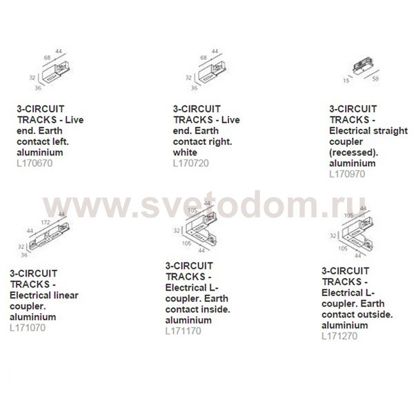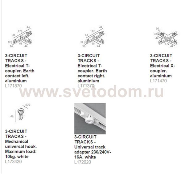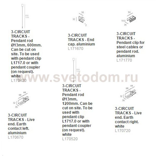 Подвесной 3-х фазный трек собирается для подвесных потолков совместно с элементами и материалами потолка. Выполняет функцию не только трека для светильника, но и дополнительного профиля для сборки гипсокартонного потолка. Управляется реостатным диммерным выключателем. Позволяет использовать отдельные включения разных групп светильников путем переключения фаз на адаптере светового прибора. Крепежные отверстия расположены на самом треке для монтажа на различной поверхности. Возможно получение различных геометрических фигур на поверхностях путем использования креплений под 90°, Т-образных и мягкого крепления для получения прочих различных углов соединения. Возможно использование специального крепления - крюка (см.раздел Комплектующие арт. L173420) для подвешивания люстр и светильников именно на трек. Запитывание с помощью специального питающего адаптера (см.раздел Комплектующие арт.L172020)/ Алюминиевый профиль доступен в цветах: белый, черный, серый.