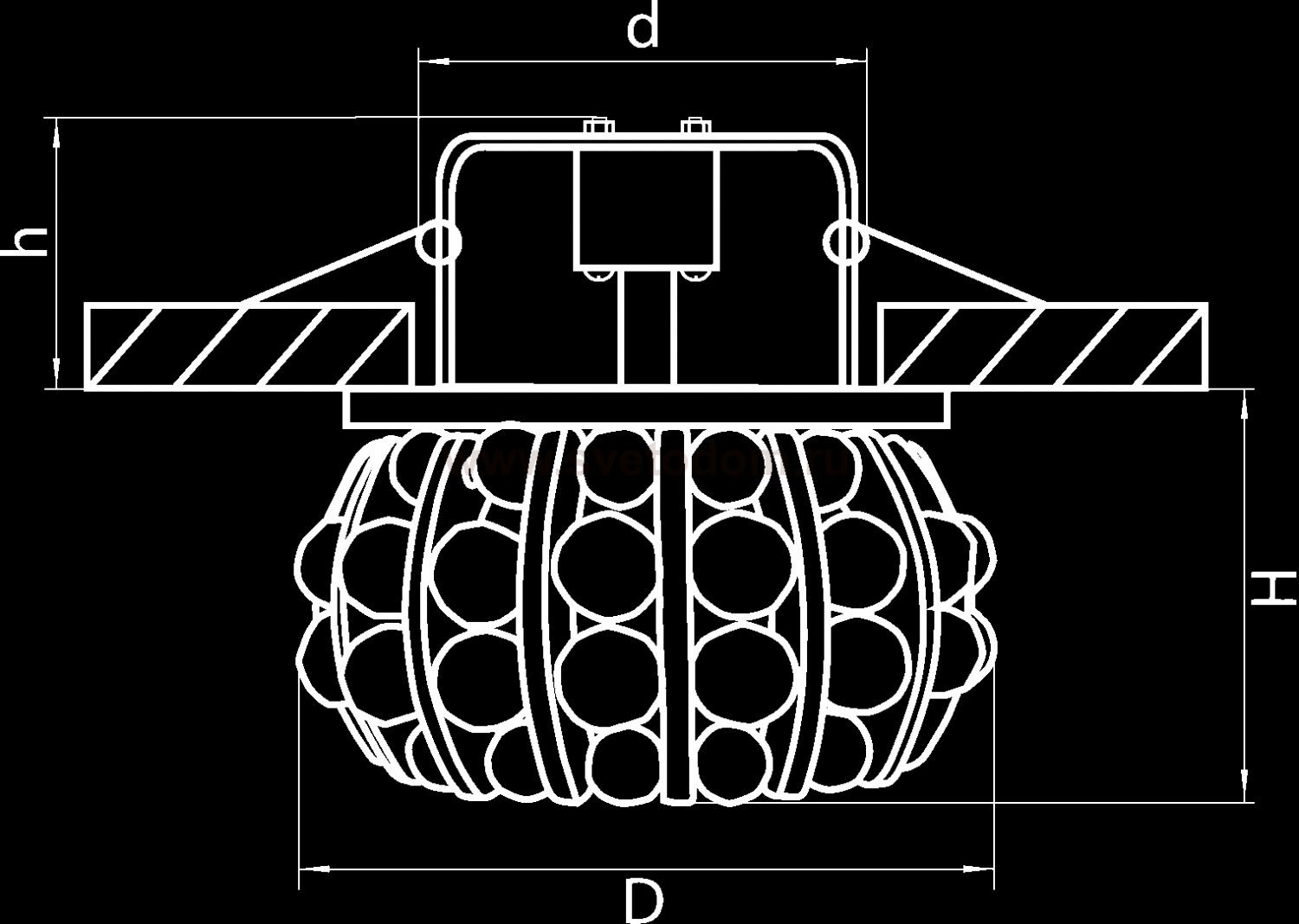 Врезное отверстие: d55 h60; Внешние габариты: D80 H45; Материал - основание/плафон: металл / Crystalline; Цвет-основание/плафон: хром/прозрачный; Лампа: 12В/220В G9 max 50Вт; Скидка, %