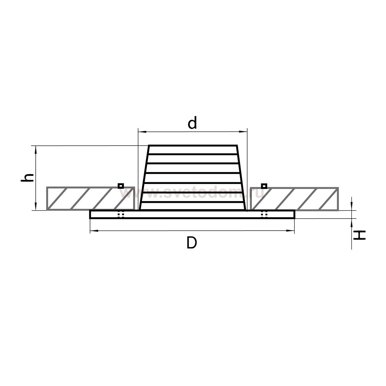 Данный размер указывает какое отверстие необходимо сделать для правильного монтажа. Зачастую светильники выбирают после ремонта и сделанных монтажных отверстий, тогда подбор осуществляется строго в размер +/- 2-5мм.