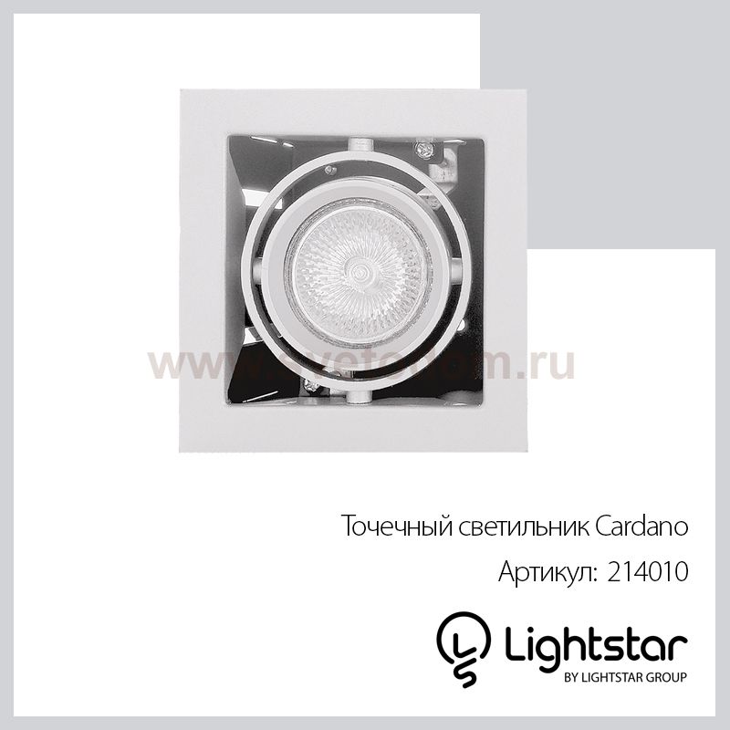 Точечный светильник Cardano – собрание геометрических фигур. В металлическую квадратную рамку вписана круглая конструкция, в которой расположена галогенная или светодиодная лампа. Конструкция имеет шарнирный механизм и способна поворачиваться под углом 160 градусов, направляя свет в необходимую точку. Врезной тип монтажа делает светильник практически незаметным на поверхности потолка.