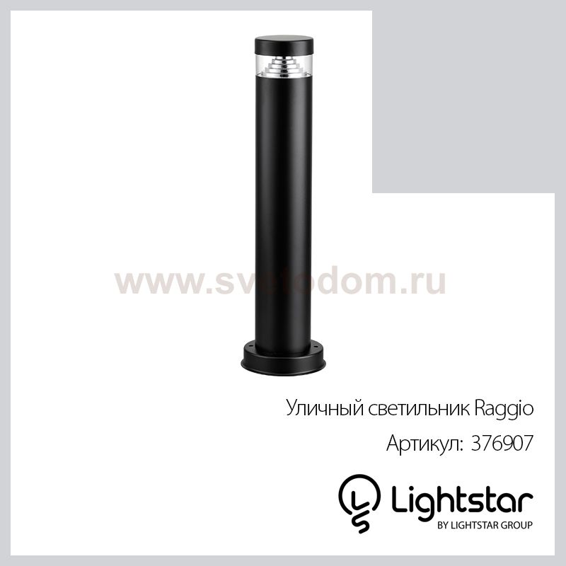 Уличный светильник Raggio – классический вариант оформления приусадебного участка. Высокий металлический корпус цилиндрической формы покрыт матовой черной краской. У самого верха за слоем прозрачного пластика скрываются встроенные светодиоды. Светильник герметичен и надежно защищен от попадания воды и грязи.