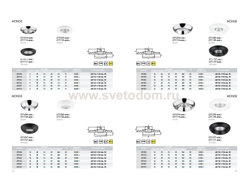 Врезное отверстие: d55 h50; Внешние габариты: D70 H12; Материал - основание/плафон: металл / ; Цвет-основание/плафон: ; Лампа: LED 7Вт, Световой поток: 560LM; Угол рассеивания: 50G; Лм/Вт, (К); 3000K