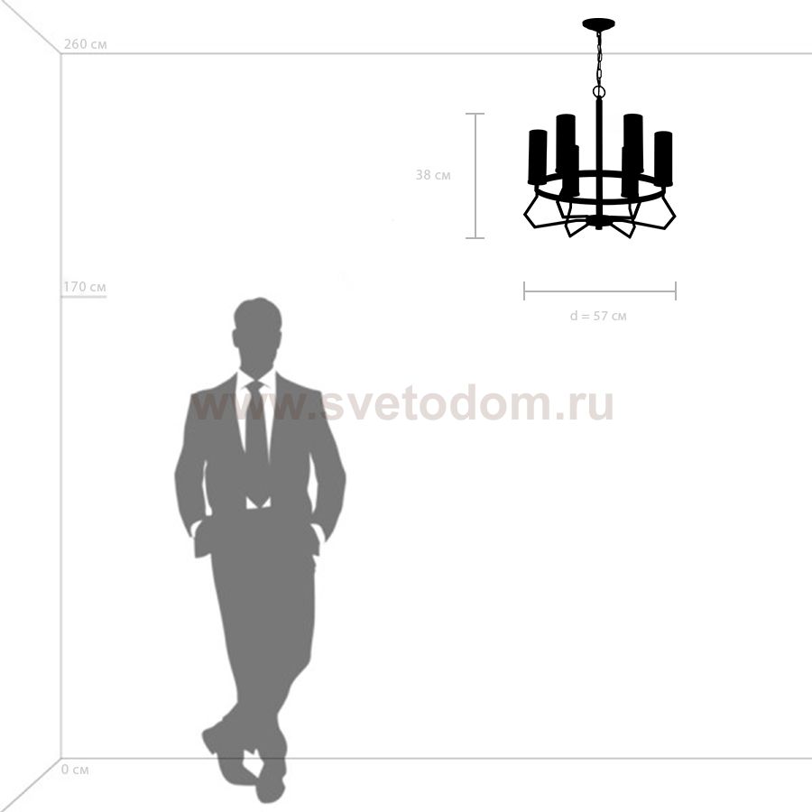 Высота min-max (см): 65-165; Ширина (см): 57; Вес (кг): 4,4; Кол-во ламп: 6xE14; Мощность max (W): 40; Цвет основания/цвет стекла или абажура: Matt Black/Satin Nickel; Штрих-код