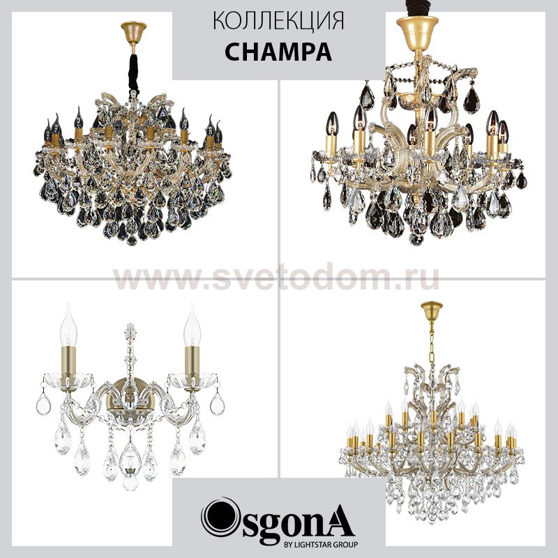 Сложный рисунок, тщательная проработка деталей и превосходное качество - ключевые характеристики всей коллекции Champa. Обилие тонких линий создает образ переплетенных ветвей, сверкающих в хрустале последних дождевых капель. Коллекция Champa отличается плотным расположением деталей: даже немногочисленные пустые пространства между рожками заполняются играющим светом, как водой. Из-за этого создается впечатление, что каждая модель коллекции дает обрести свету форму!
