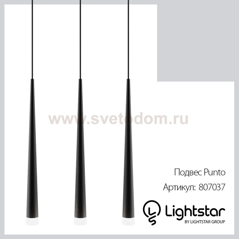 Подвес Punto воплощения совершенства линий и современных тенденций в дизайне. Свет из матовых плафонов будто продолжает конструкцию светильника. Матовый черный цвет покрытия прекрасно впишется в любой современный интерьер, и может выполнять функцию как основного света, так и быть способом зонирования помещения. Стильная люстра Lightstar 807037 станет украшением любого дома. Эта модель от известного производителя не оставит равнодушным ценителей красивых и оригинальных предметов интерьера. Люстра Lightstar 807037 обеспечит равномерное распределение света по всей комнате. При выборе обратите внимание на характеристики, позволяющие приобрести наиболее подходящую модель. Купить понравившуюся люстру по доступной цене Вы можете в интернет-магазине «Светодом».