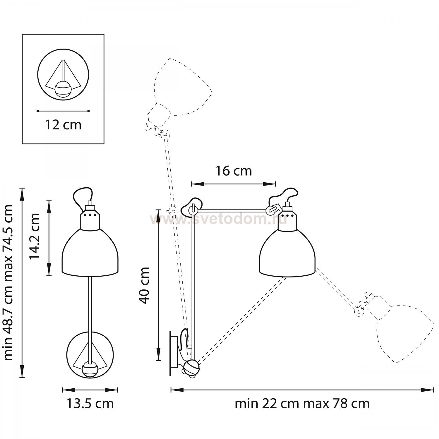 Высота min-max (см): 48,7-74,5; Ширина (см): 13,5; Глубина (см): 22-78; Вес (кг): 1,5; Кол-во ламп: 1; Мощность max (W): 40; Цвет основания/цвет стекла или абажура: Chrome/glass shade;
