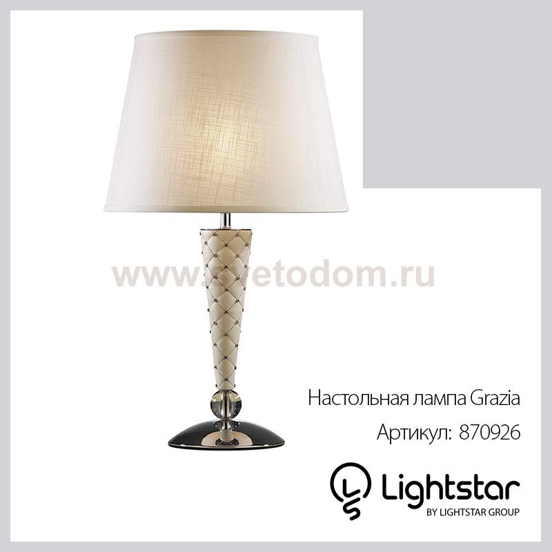 Настольная лампа Grazia нежная и грациозная. Металлическое основание покрыто глянцевой антикоррозионной краской. Ножка украшена перламутровой тканью и стразами. Тканевый абажур молочного цвета мягко рассеивает свет, создавая эффект приглушенного романтического освещения. Лампы теплого спектра добавят уюта в спальню или гостиную. Настольная лампа Lightstar 870926 – прекрасный вариант для завершения интерьера. Ее можно включить одновременно с люстрой для более яркого освещения или без нее для создания уютной атмосферы, настраивающей на отдых. Купить настольную лампу Lightstar 870926 Вы можете с помощью виртуальной «Корзины» или по контактным номерам, указанным на сайте.