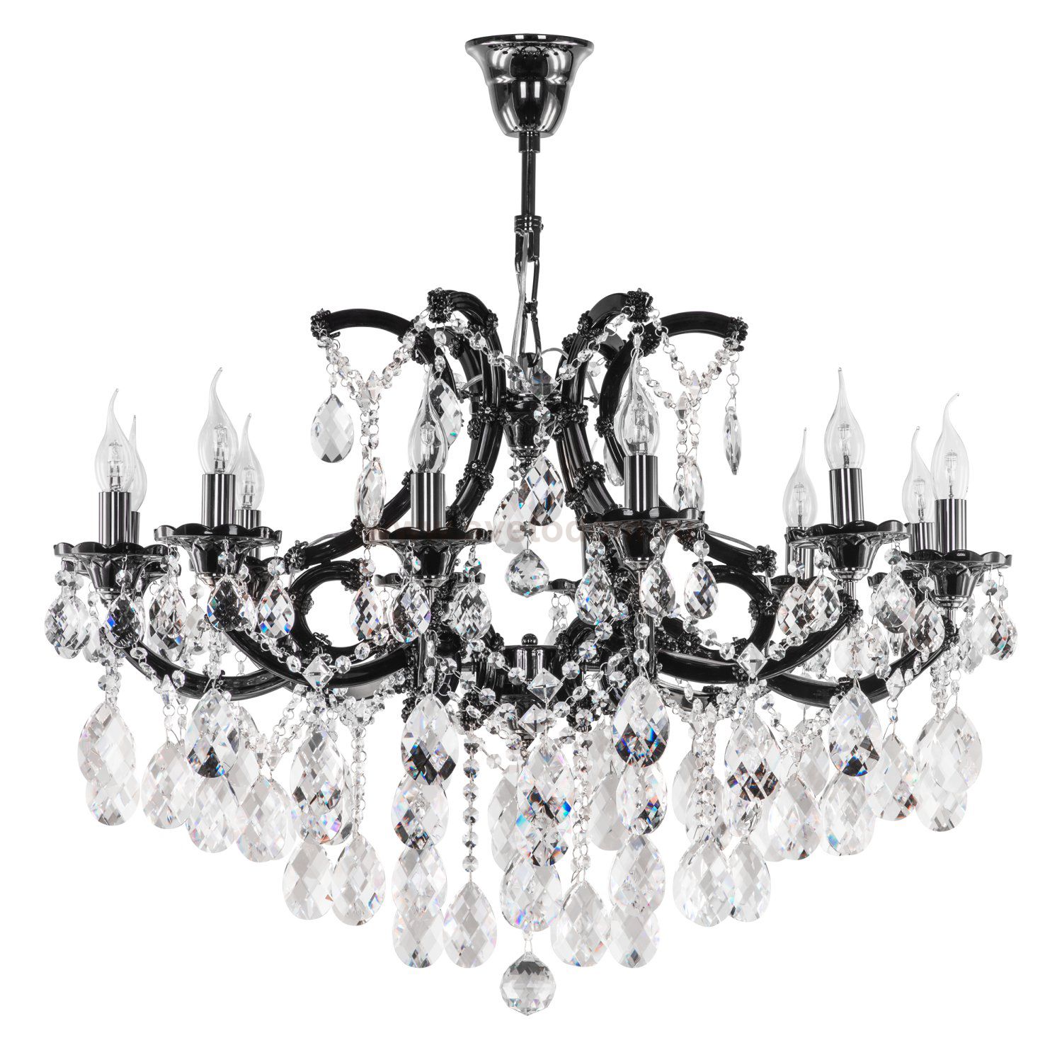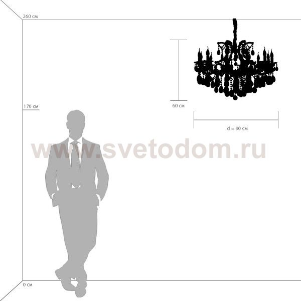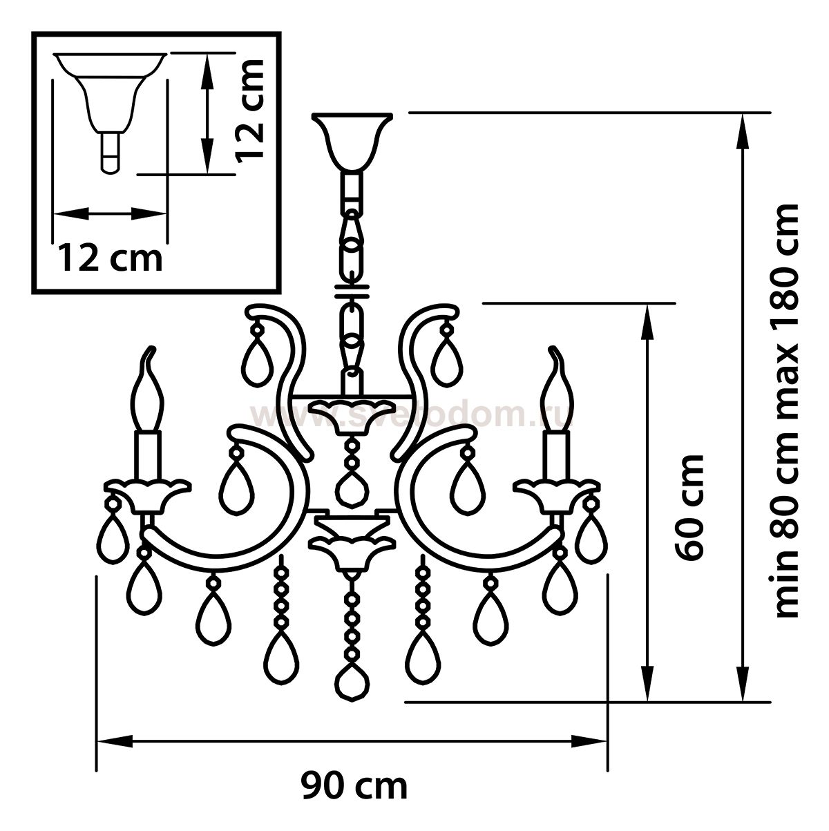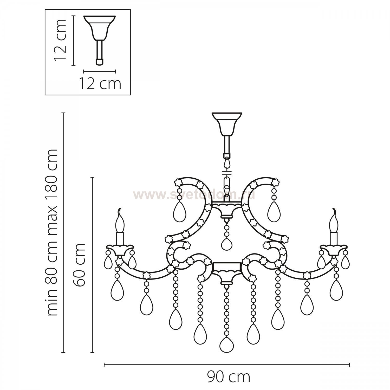 \Высота min-max (см): 80-180; Ширина (см): 90; Вес (кг): 19,5; Кол-во ламп: 12xE14; Мощность max (W): 60; Цвет основания/цвет стекла или абажура: Black Chrome;