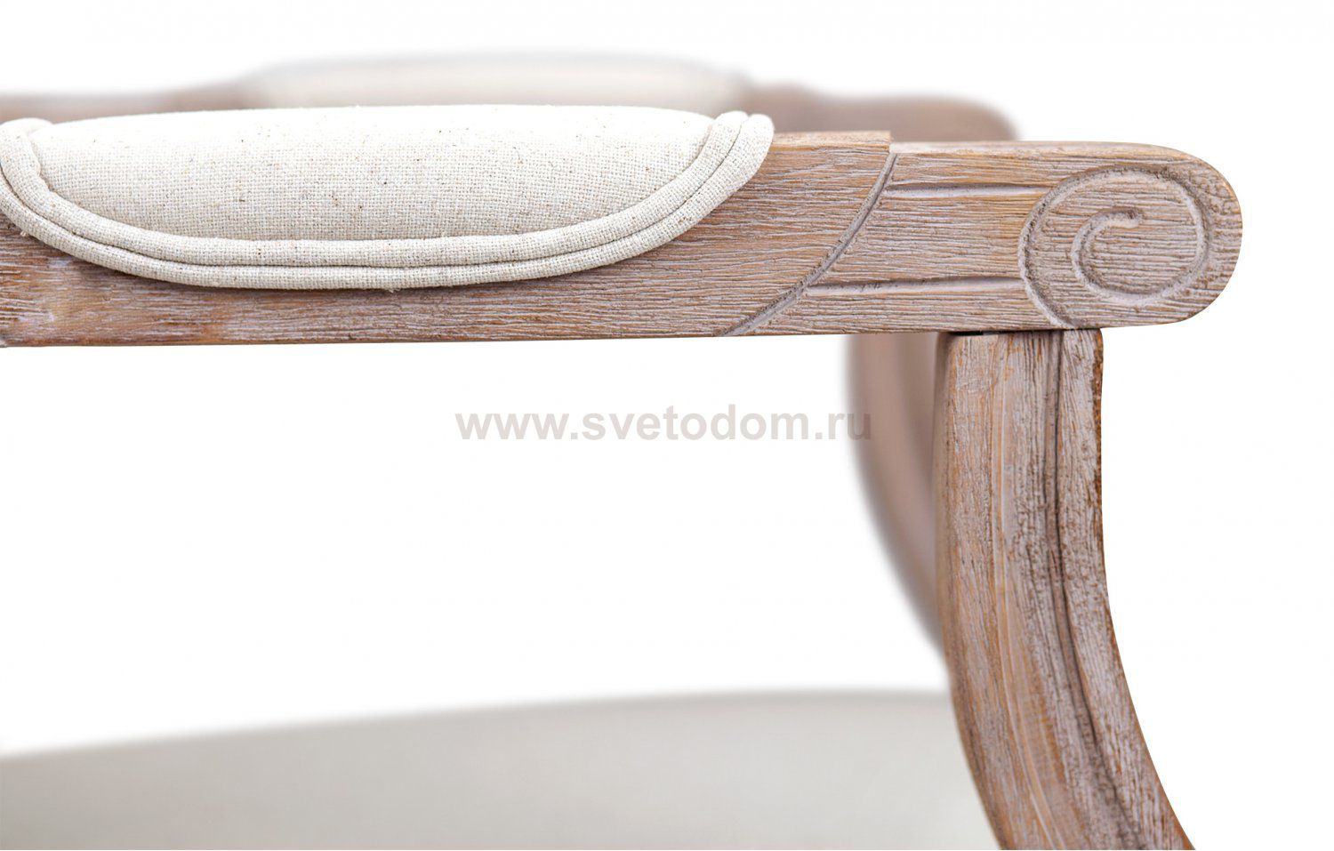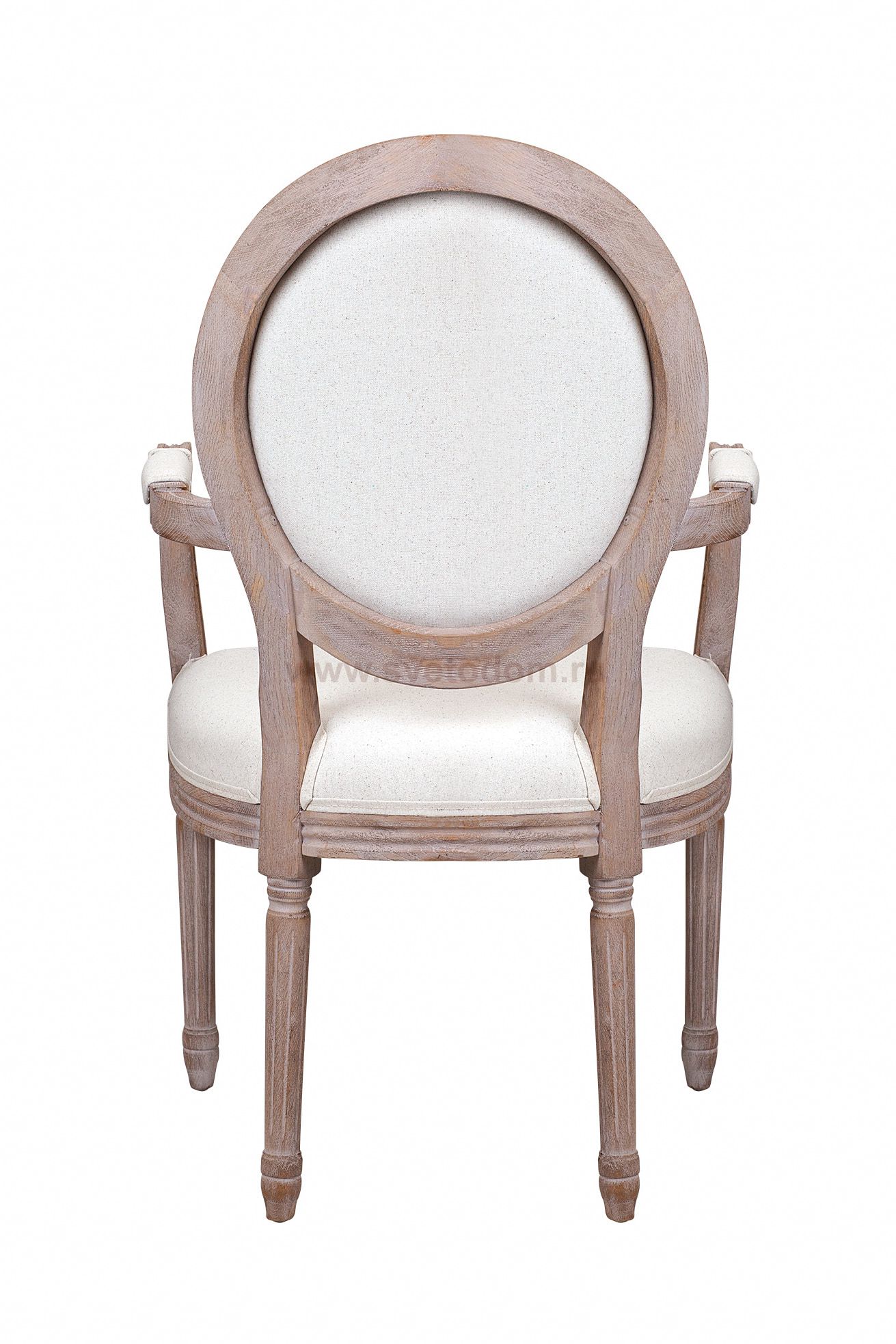 Стул Volker arm oak, выполненный на основе прочного каркаса из натурального дуба. Верхняя и нижняя части ножек круглого сечения декорированы резьбой. Спинка в виде круглого медальона в деревянном обрамлении и мягкое сиденье обиты тканью белого цвета, произведенной из смеси волокон хлопка и льна. Присутствуют фигурные подлокотники с мягкими накладками, повышающие удобство модели.