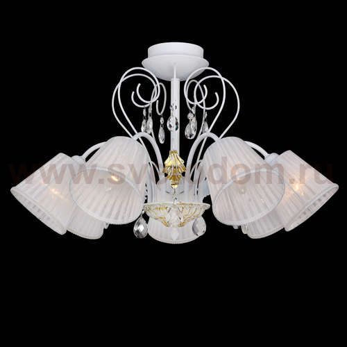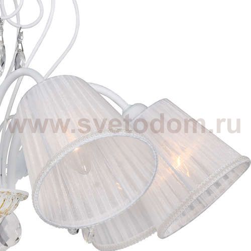 Арматура окрашена в белый цвет с золочением декоративных элементов. Светильники декорированы тканевыми абажурами из белой органзы, направленными вниз, и хрустальными подвесками высшего качества. Материал плафона