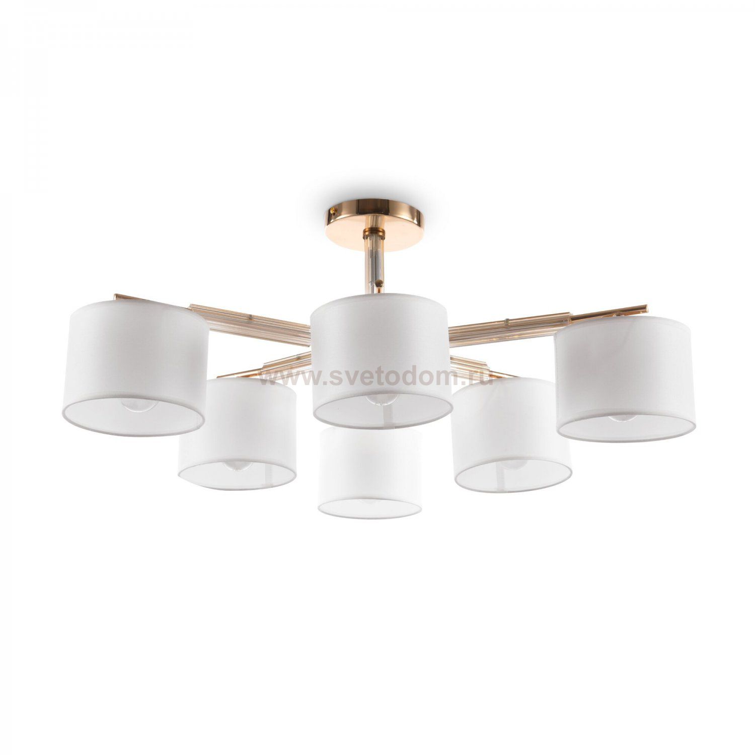 Арматура – металл + стекло, цвет - золото. Универсальные тканевые абажуры в белом цвете. Декоративные элементы из прозрачного рельефного стекла. Источник света - лампа с цоколем Е27.