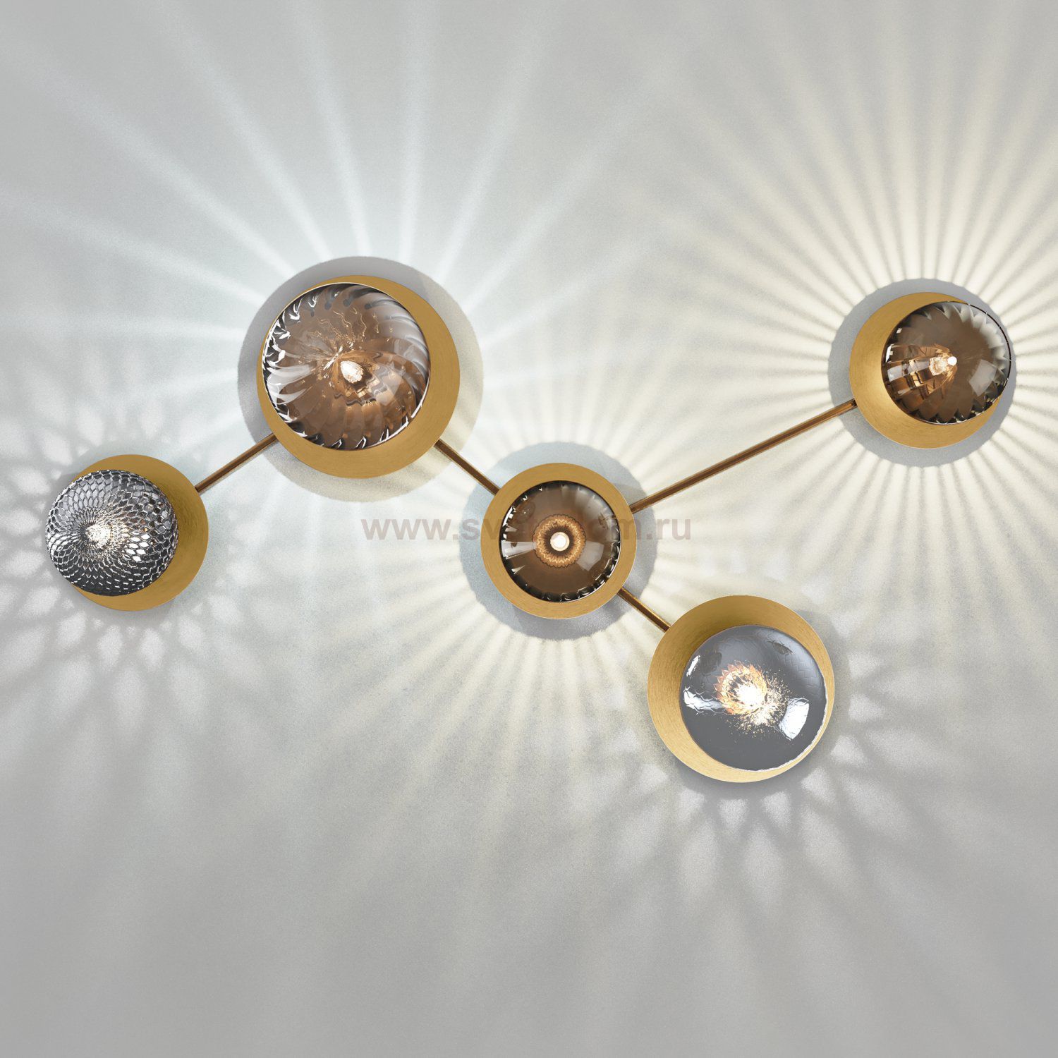 Компактное металлическое основание и арматура цвета латуни. Две модели с плафонами белого цвета и две с разноцветными плафонами: серый, прозрачный, дымчатый и оттенка коньяка. Источник света: цоколь Е14. Компактное основание светильника прилегает к потолку. Функциональное основное освещение. Местоположение разноцветных плафонов можно менять, создавая композиции по своему вкусу. Поверхность плафонов имеет орнамент, при включении светильника на потолке создаются узоры.