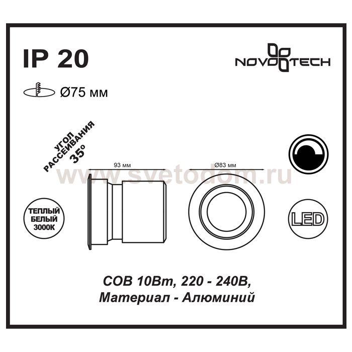 Встраиваемый светодиодный светильник направленного света предназначен для общего освещения закрытых помещений, административно-общественных зданий. Корпус светильника изготовлен из алюминиевого сплава и окрашен порошковой краской. Угол рассеивания 35?. Отражатель и светодиодный модуль закрыты защитным стеклом. Цветовая температура 3000К. Безопасность