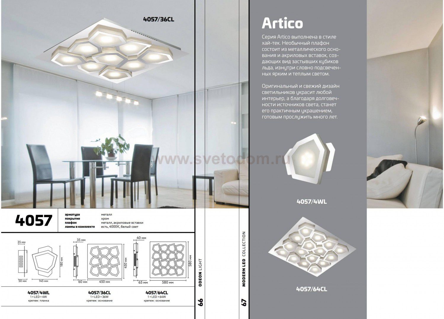 Люстра 4057/64CL серии ARTICO выполнена в стиле хай-тек. Необычный плафон состоит из металлического основания и акриловых вставок, создающих вид застывших кубиков льда, изнутри словно подсвеченных ярким и теплым светом. Оригинальный и свежий дизайн светильника украсит любой интерьер, а благодаря долговечности источников света, станет его практичным украшением, готовым прослужить много лет. Цоколь LED. Мощность 64W.
