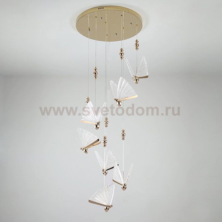 Подвесной светильник Delight Collection OM8201008-7 rose gold с семью подвесами на круглом основании с отделкой розовое золото. Подвесы в форме бабочек с крыльями из прозрачного стекла. |