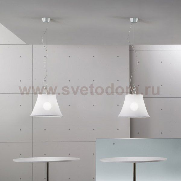 Подвесной светильник нарегулируемом тросе с абажуром из сетчатой ткани белого, лилового и песочного цветов и каркасом из алюминия серого цвета. Возможен вариант использования люминесцентной лампы.