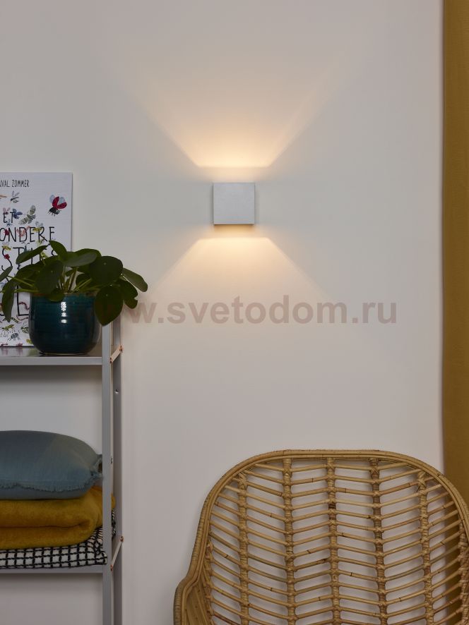 The wall lamp Lucide Devi is a beautifully finished aluminium armature light. This wall lamp, often used by architects, best comes into its own on a lovely stucco wall or a tough, coarse masonry wall. This wall lamp namely provides a beautiful hourglass-shaped beam. With a back plate of 10,5cm x 8cm, the Devi is easy to place over a central box. The Devi is made with a G9 high-voltage fitting, but is delivered without a light source. Choose a traditional G9 halogen spot (max 42W) or an energy-saving dimmable or non-dimmable G9 LED light source. LED or traditional halogen, because there is no transformer in the Devi, this armature light is certainly very simple to dim (with a basic dimmer - not included). The Devi is available in the colours of white and aluminium.
