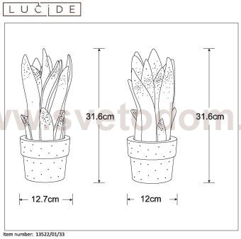 Enjoyable, pleasant and a nice eyecatcher. The Sansevieria table lamp is right at home on the bedside table of your child or as a playful touch to your interior. You operate Sanseviera with the switch on the cord. The foot – or should we say pot? – of 12 by 12 centimetres lights up even the smallest corner in a jiffy. The leaves reach up to 31 centimetres high. Sanseviera is made of high-end ceramics.