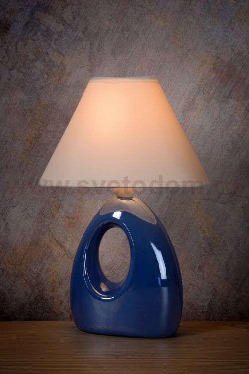 An asymmetrical shape with a striking oval opening and a beautiful rounded whole in a modern style. This Hoal table lamp has it all. For those who love modern art and architecture, this is a real winner. Not coincidentally, Hoal is inspired by beautiful rounded modern sculpture. The striking base in gleaming blue is made of ceramic. A pearl effect provides a beautiful finish. The lampshade is made of cotton. The white colour connects perfectly to the whole. This table lamp catches the eye in a modern interior, on the table, on a sideboard or a modern nightlight.