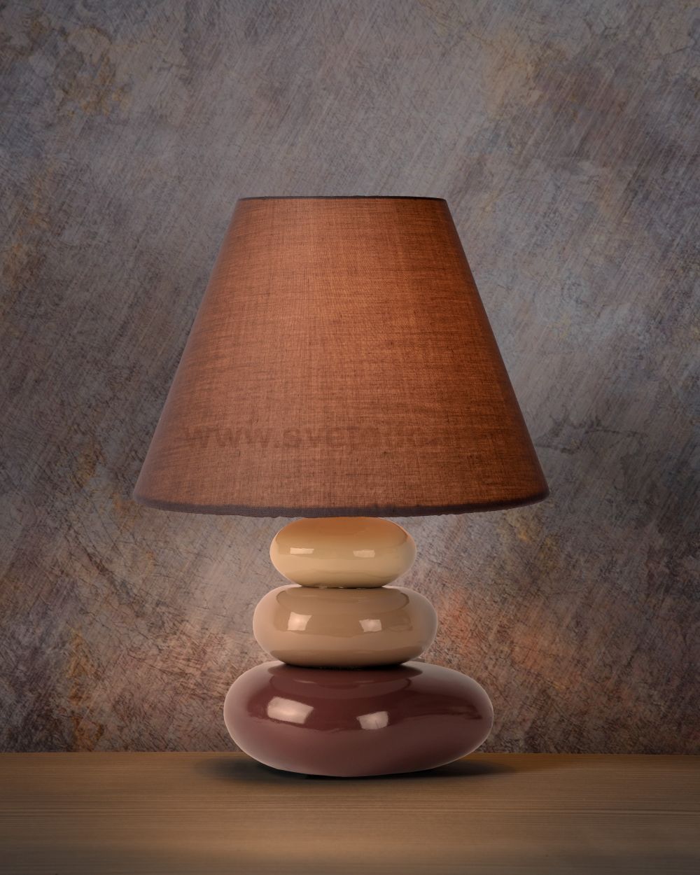 Balance at its best. This table lamp, called Karla, draws its inspiration from cairns. Those are the stacks of natural stone that hikers arrange in order to mark a path or hilltop. The whimsical, irregular shape of the ceramic base consists of three parts in brown earth tones that visually hold each other in balance. In combination with a brown cotton lampshade, the natural link is fully integrated. For both rustic environments and modern interiors, this table lamp is a beautiful bonus. The light is distributed by the lampshade with a diameter of 18 centimetres.