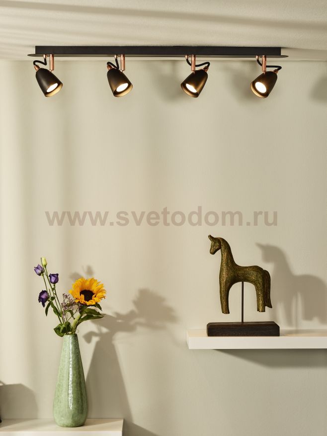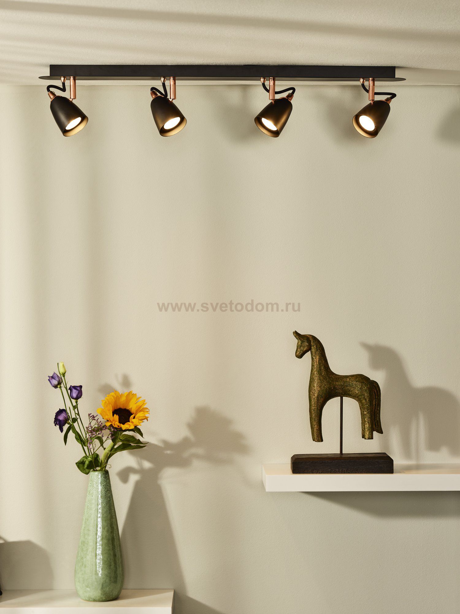 A four-man lighting team for your living room ceiling. Ride-LED's four GU10 fittings are strong together, with four adjustable LED spots as team mates. A black lamp with a finish in copper is the proud home base. These LED lamps are happy to work with an external dimmer. You thus determine the right set-up in your sitting room yourself. Hang this extensive lighting network above your seating area or coffee table. Let everyone enjoy the warm, white light of 3000 K.