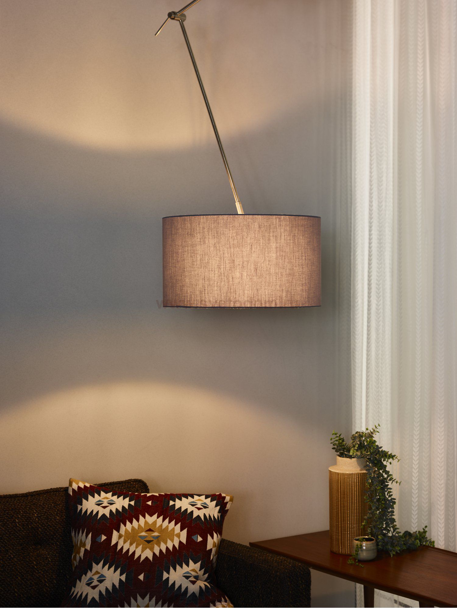 Versatile, practical, flexible and yet very stylish? The Eleni pendant light from Lucide has it all. The long chrome arms and 3 knee joints make it possible to hang the Eleni pendant light decentrally if desired. Should the central box not be exactly above the centre of the table, the Eleni offers a solution. The Eleni is a sleekly designed armature lamp with a high degree of finish. Due to the many positions that the Eleni can adopt, the lamp, despite its sleek lines, has a very playful character. The Eleni comes with a cylindrical cotton shade 42cm in diameter. The Eleni is available in neutral colours of white or grey.