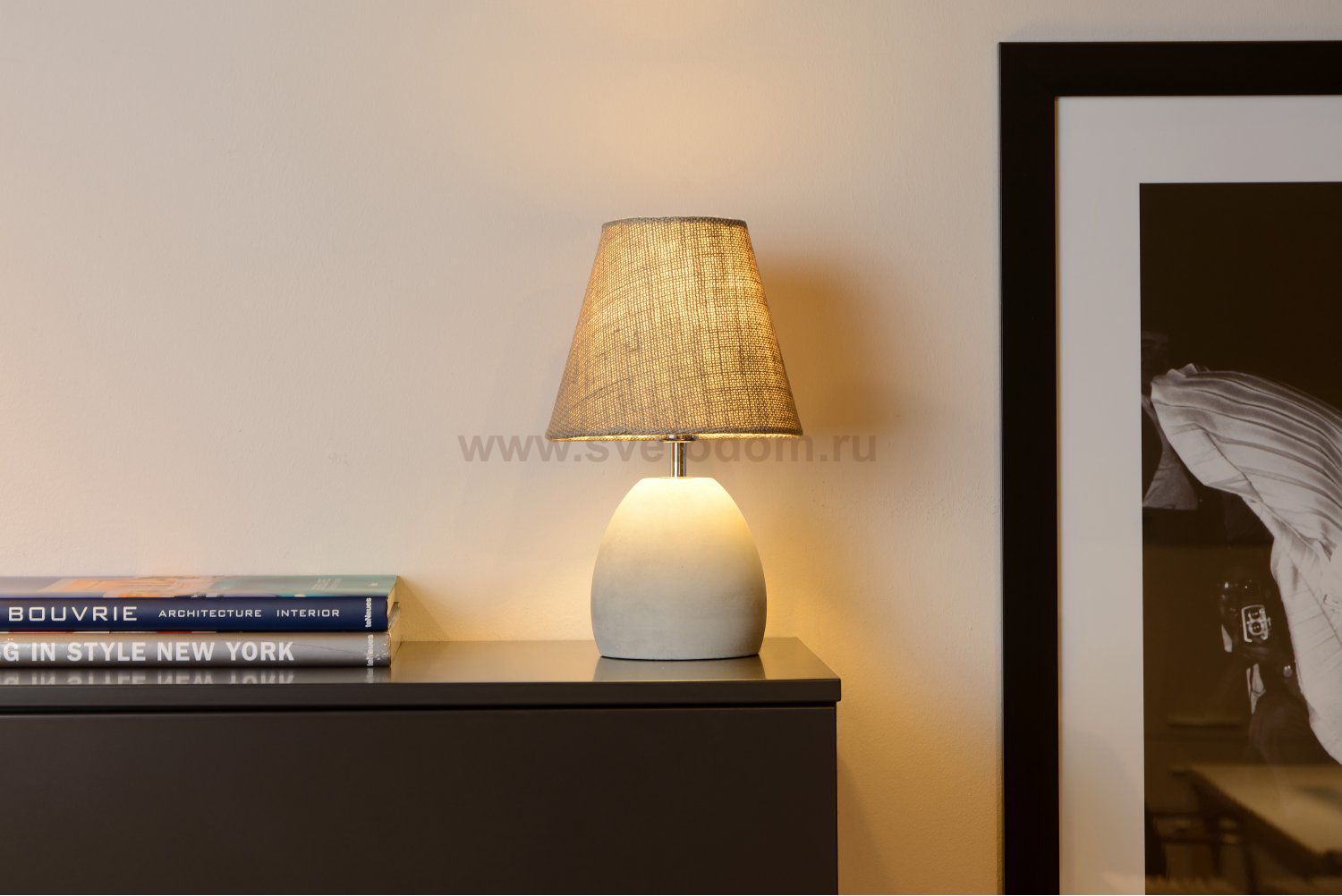 Natural materials in an organic shape. Lighting manufacturer Lucide proudly introduces Solo. This table lamp consists of a beautifully designed concrete base and a classic lamp shade with a conical shape. Solo fits outstandingly in a modern home as extra lighting on a table or dresser. The entire lamp is just 31 centimetres tall.