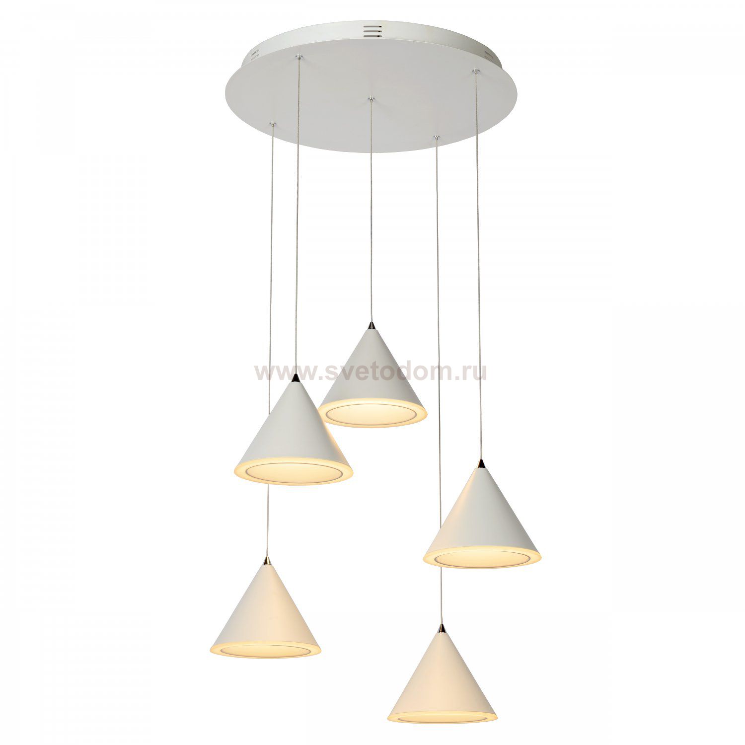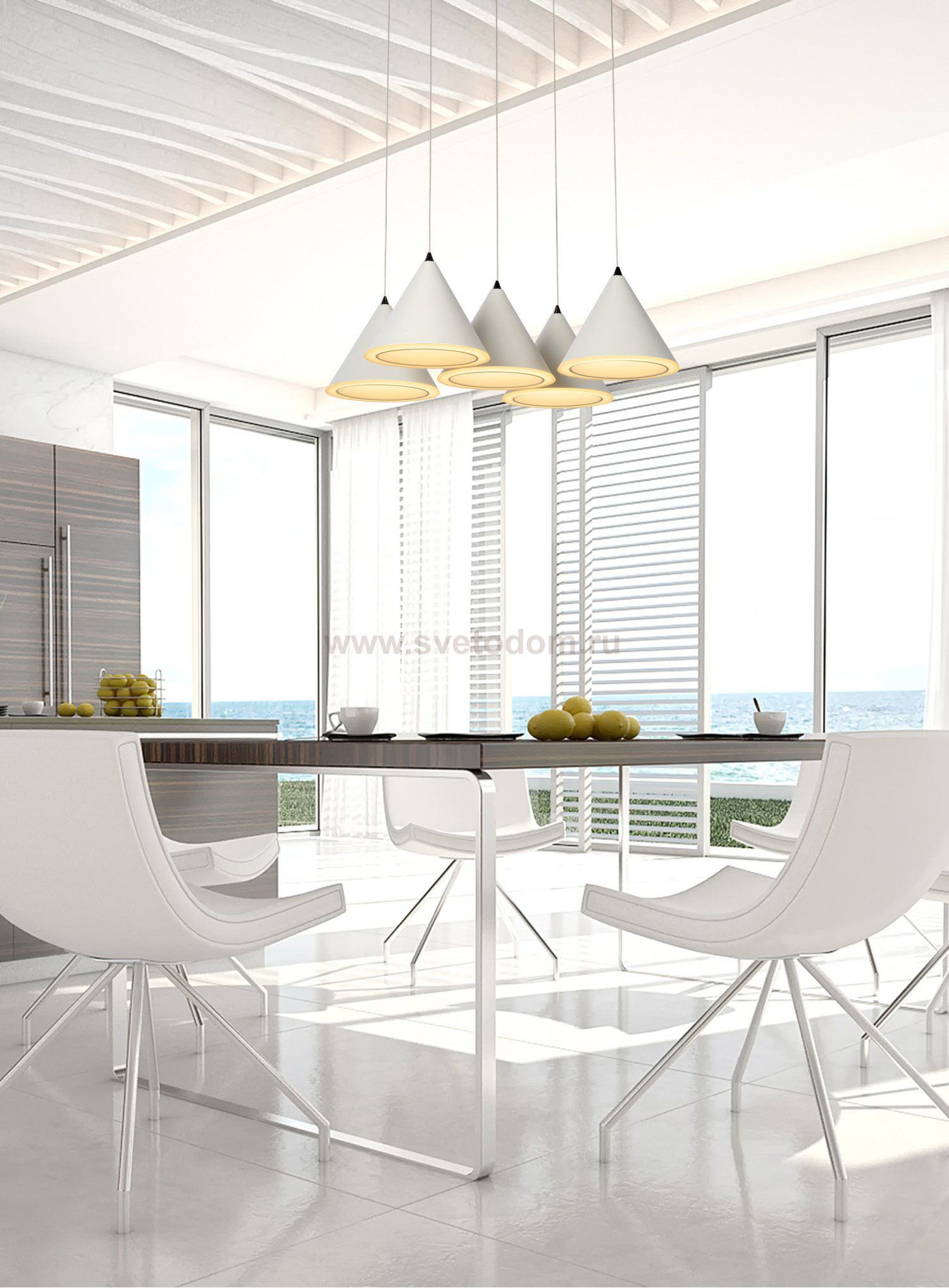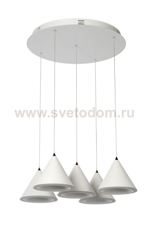 This Torben LED pendant lamp combines design with functionality. The conical shapes dangle like a work of art on the metal base. White is the basic colour of this pendant lamp, but fine finishes in black add beautiful, small details. The light is distributed below the five cones thanks to integrated LEDs. They provide a nice, warm, white light. At installation - with or without an external dimmer - you choose the height of the hanging lamps yourself.