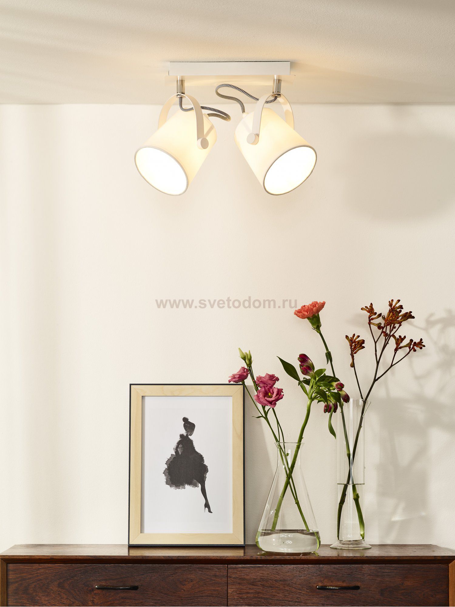 Two stylish spotlights on a metal base. The inimitable qualities of ceiling spotlight Edo read like a fairy tale. The fabric lamp shade keeps an eye on everything like elegant opera glasses on your ceiling. Is extra light needed or should different interior elements be highlighted? Then Edo is ready. The ceiling spotlight is easy to connect to a dimmer. The sleek, attractive design is a given.