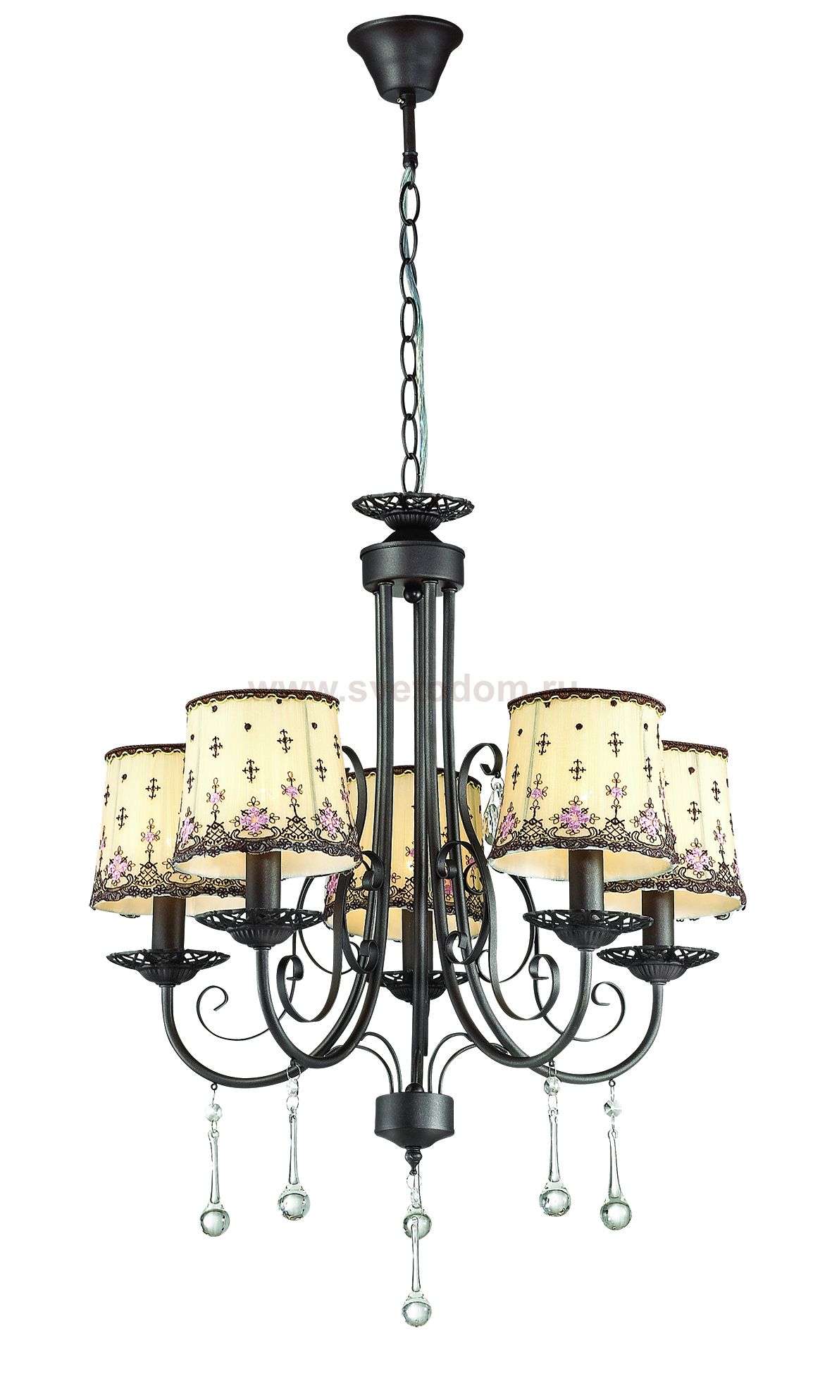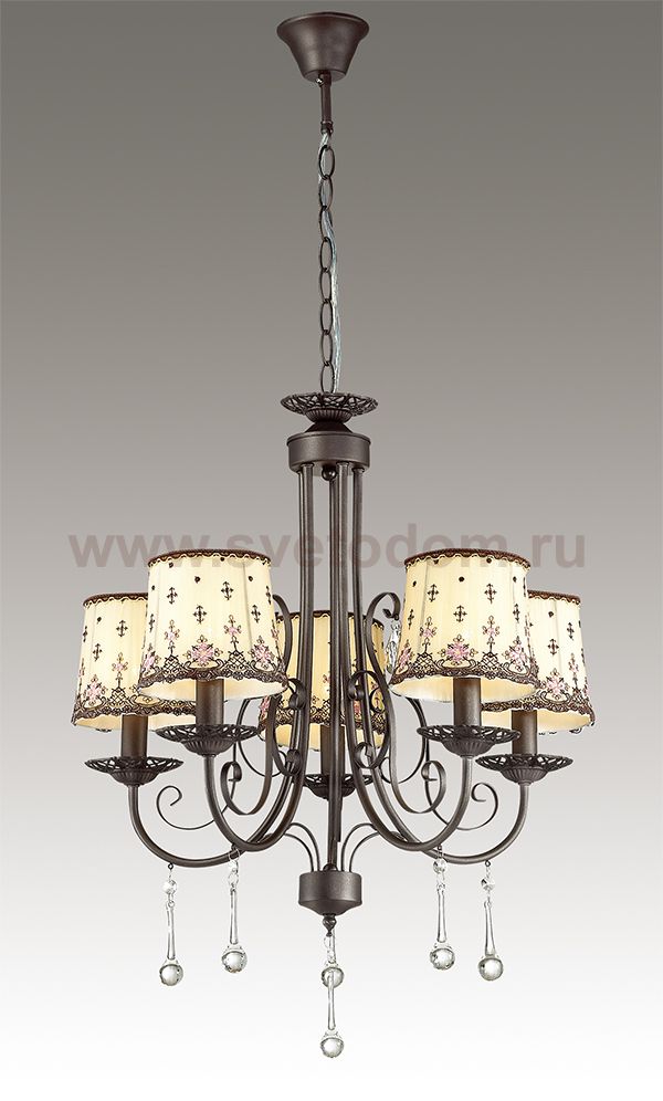 Люстра 3054/5 серии Calma оформлена в классическом стиле. Люстра состоит из тканевых абажуров пастельных тонов с цветочным принтом, украшенных ажурной тесьмой и арматуры благородного кофейного цвета. Хрустальные и стеклянные подвески придают особую изящность модели. Цоколь E14. Мощность 5x40W. Нет ламп в комплекте.