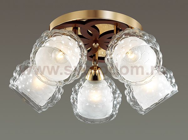 Люстра потолочная 3057/5C серии Federro оформлена в современном стиле. Люстра состоит из двойных плафонов, нижняя часть которых выполнена из матового стекла, а верхняя - из актуального объемного стекла, и арматуры золотого цвета, украшенной ажурными декоративными элементами под дерево. За счет необычности плафонов данная модель будет очень оригинально и стильно смотреться у Вас дома. Цоколь E14. Мощность 5x60W. Нет ламп в комплекте.
