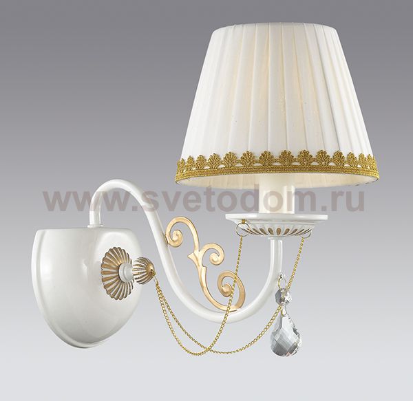 Арматура, декор: металлическая белая арматура украшена золотой краской, металлическими ажурными элементам, цепочками и подвесками из хрусталя; плафон: абажур из органзы с ажурной тесьмой Материал плафона