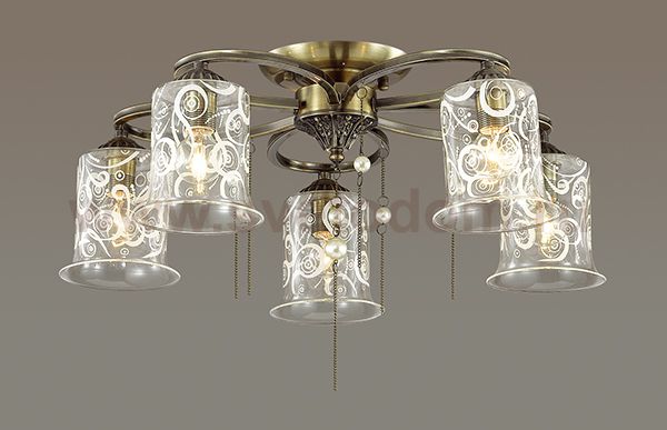 Люстра потолочная 3242/5C серии Otalia оформлена в классическом стиле. Люстра состоит из стеклянных плафонов с вензельным рисунком и арматуры бронзового цвета, украшенной цепочками с бусиной под жемчуг. Оригинальная форма арматуры, а также скромная элегантность цепочек позволяет назвать данную модель одной из самых интересных в коллекции. Цоколь E14. Мощность 5x60W. Нет ламп в комплекте.