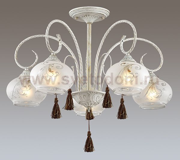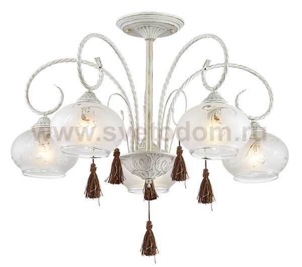 Люстра потолочная 3253/5C серии Dafna оформлена в классическом стиле. Люстра состоит из плафонов, выполненных из пескоструйного стекла, и арматуры белого с золотой патиной цвета, украшенной необычными кисточками. Данная модель благодаря своему экстравагантному дизайну создаст необычайную атмосферу у вас в доме. Цоколь E14. Мощность 5x60W. Нет ламп в комплекте.