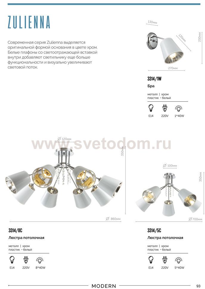Современная и оригинальная линия Zulienna выделяется оригинальной формой основания в цвете хром. Тканевые белые плафоны со светоотражающей вставкой изнутри добавляют светильнику еще больше функциональности и увеличивают визуально световой поток.