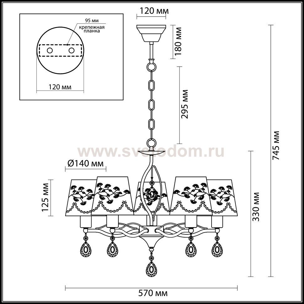 Арматура, декор: металл, хрусталь; абажур ткань Материал плафона