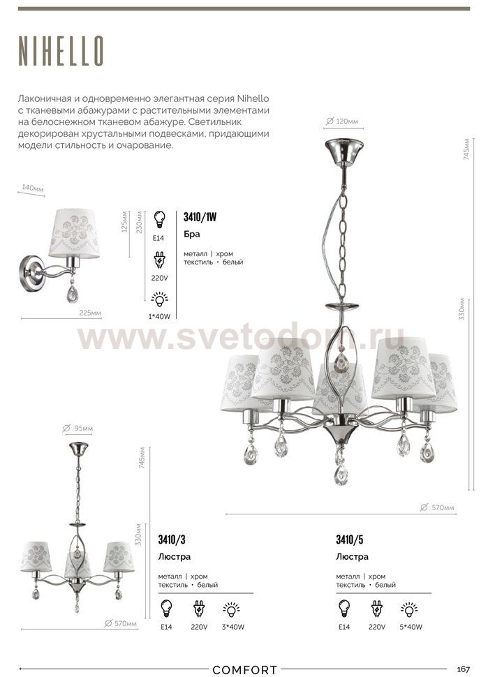 Лаконичная и одновременно элегантная линия Nihello c тканевыми абажурами с растительными элементами на белоснежном тканевом абажуре. Светильник декорирован хрустальными подвесками, придающими модели стильность и очарование.