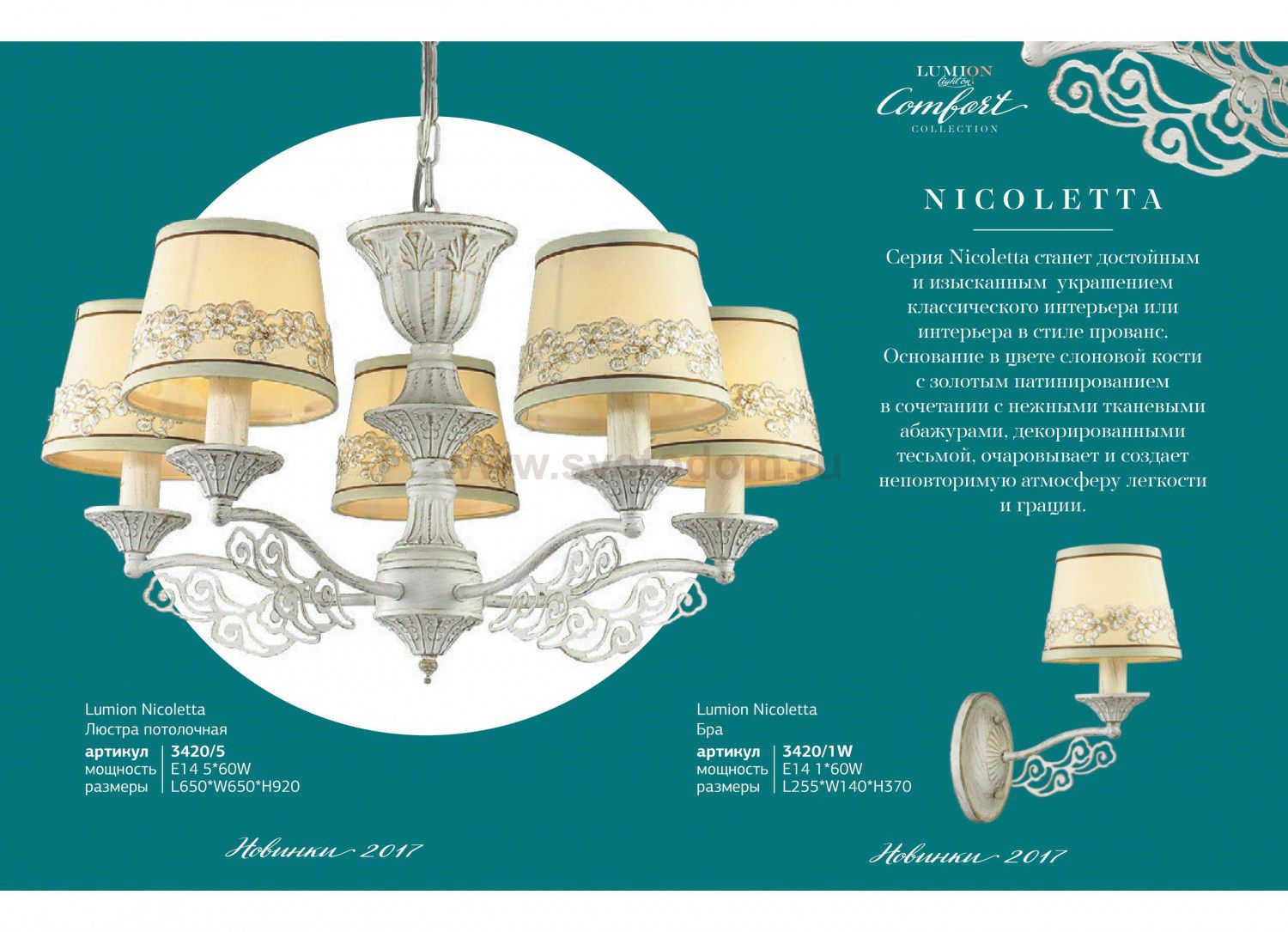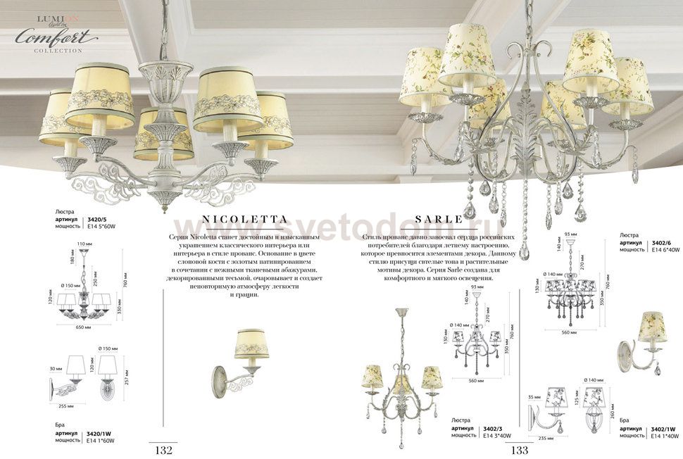 Серия Nicoletta в стиле прованс станет достойным и изысканным украшением классического интерьера или интерьера в стиле прованс. Основание в цвете слоновой кости с золотым патинированием в сочетании с нежными тканевыми абажурами, декорированными тесьмой, очаровывает и создает неповторимую атмосферу легкости и грации.