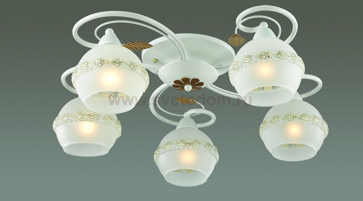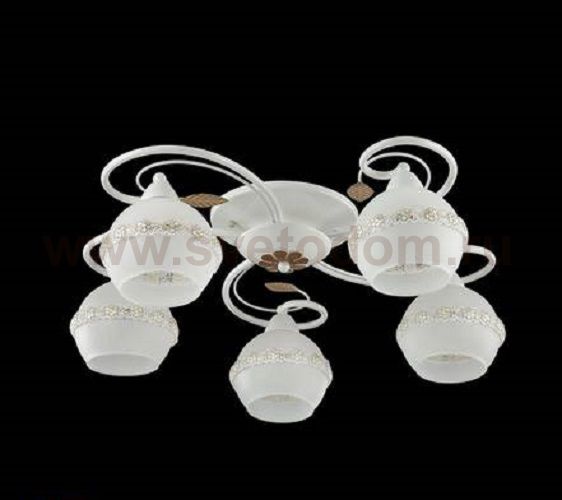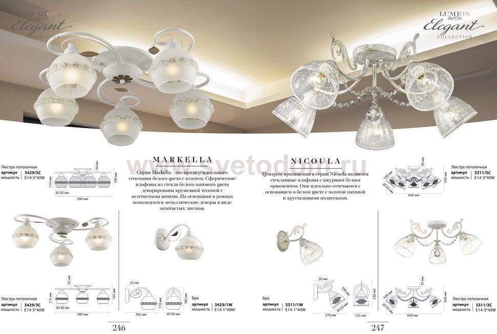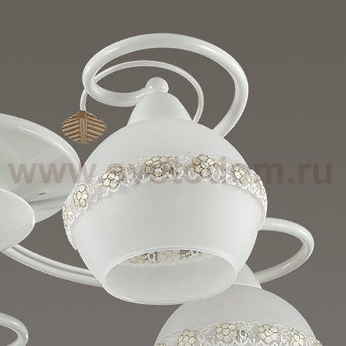Серия Markella - это пример идеального сочетания белого цвета с золотом. Сферические плафоны из стекла белого матового цвета декорированы кружевной тесьмой с золттистыми нитями. На основании и рожках используются металлические декоры в виде золотистых листков.