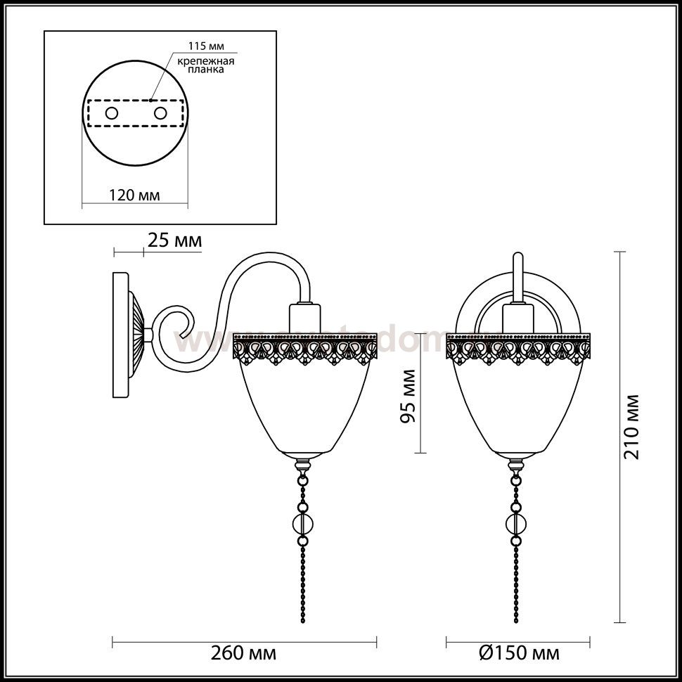 Арматура, декор: металл, цепочки, хрусталь; плафон стекло, металл Материал плафона