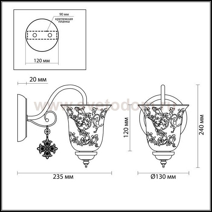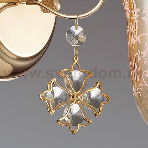 В серии Leonidas используются изящные и оригинальные плафоны из стекла медового цвета с растительным орнаментом. Светильник декорирован потрясающими подвесками из хрусталя в металлическом обрамлении.